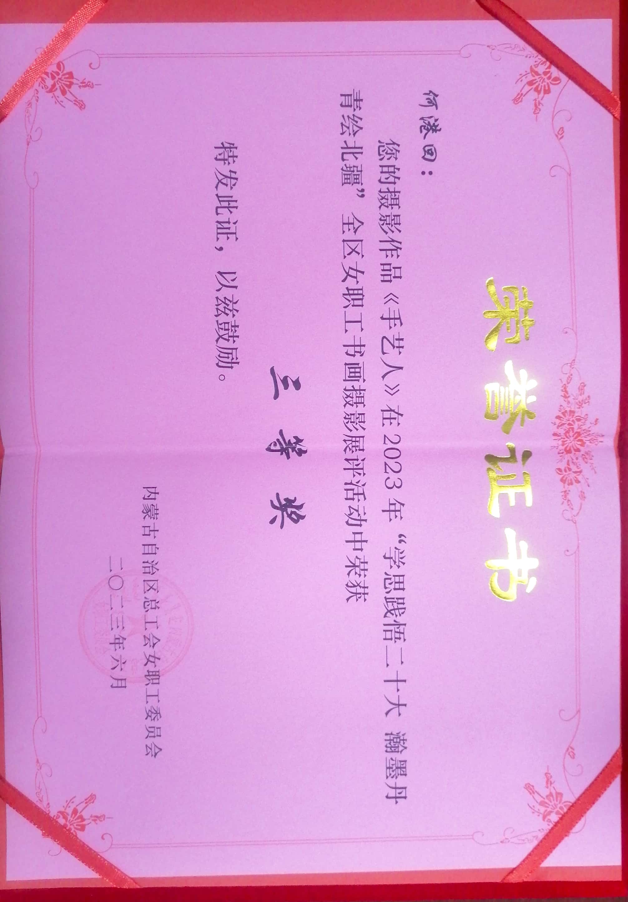 近日,內(nèi)蒙古自治區(qū)總工會(huì)女職工委員會(huì)舉辦的“學(xué)思踐悟二十大 翰墨丹青繪北疆”全區(qū)女職工書畫攝影展評(píng)活動(dòng)中,中國(guó)二冶路橋分公司練市大運(yùn)河項(xiàng)目部預(yù)算員何港回響應(yīng)號(hào)召積極參與,最終參評(píng)的攝影作品《手藝人》在此次書畫攝影展評(píng)活動(dòng)中榮獲三等獎(jiǎng)。