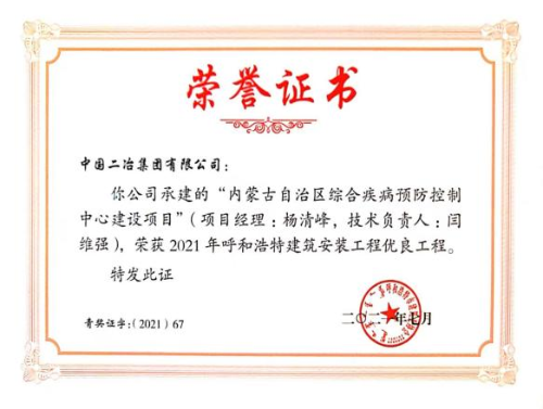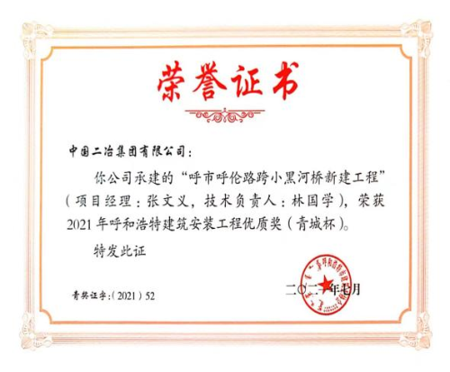 近日,呼和浩特市建筑業(yè)協(xié)會公布了2021年度呼和浩特建筑安裝工程優(yōu)質獎的評審結果。由中國二冶集團內蒙古分公司承建的呼和浩特市呼倫路跨小黑河橋工程榮獲建筑安裝工程優(yōu)質獎(“青城杯”),內蒙古自治區(qū)綜合疾病預防與控制中心項目榮獲“優(yōu)良工程獎”。