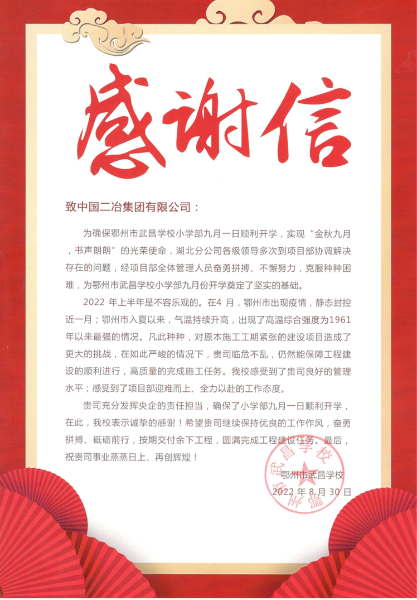 感謝信不僅是對(duì)中國二冶湖北分公司鄂州市武昌學(xué)校項(xiàng)目的高度認(rèn)可,也是對(duì)項(xiàng)目部全體人員日夜兼程、風(fēng)雨無阻艱苦工作的鼓勵(lì)與肯定。湖北分公司在接下來的工程建設(shè)任務(wù)中,將繼續(xù)以“高要求、高標(biāo)準(zhǔn)、高水平”的施工理念,強(qiáng)化安全質(zhì)量管理、發(fā)揮團(tuán)隊(duì)凝聚力,以更高昂的精神狀態(tài),更踏實(shí)的優(yōu)良作風(fēng),萬眾一心,艱苦奮斗,繼續(xù)打造優(yōu)質(zhì)工程,展現(xiàn)央企實(shí)力擔(dān)當(dāng)。
