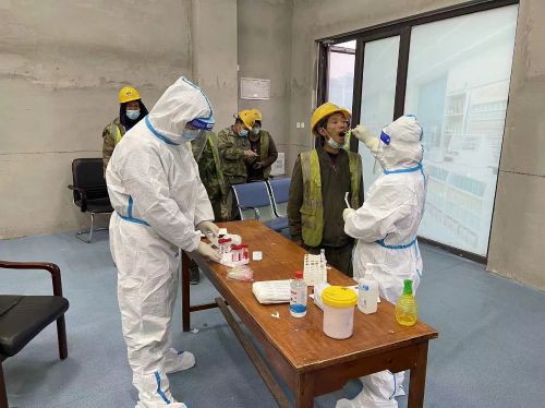 中冶德賢公館項目部作為路橋分公司唯一的在包項目,面對突如其來的疫情,逆行出戰(zhàn),與時間賽跑。項目經(jīng)理帶隊堅守一線,為確保項目建設有序進行,挑選符合條件的人員主動隔離入住項目部,派出“黨員先鋒隊”和“青年志愿者服務隊”,組織每日進場工人核酸檢測、健康碼查驗、區(qū)域內(nèi)全方位消殺,培訓后協(xié)助醫(yī)護人員行核酸采樣,輔助一線工作者核酸檢測。
